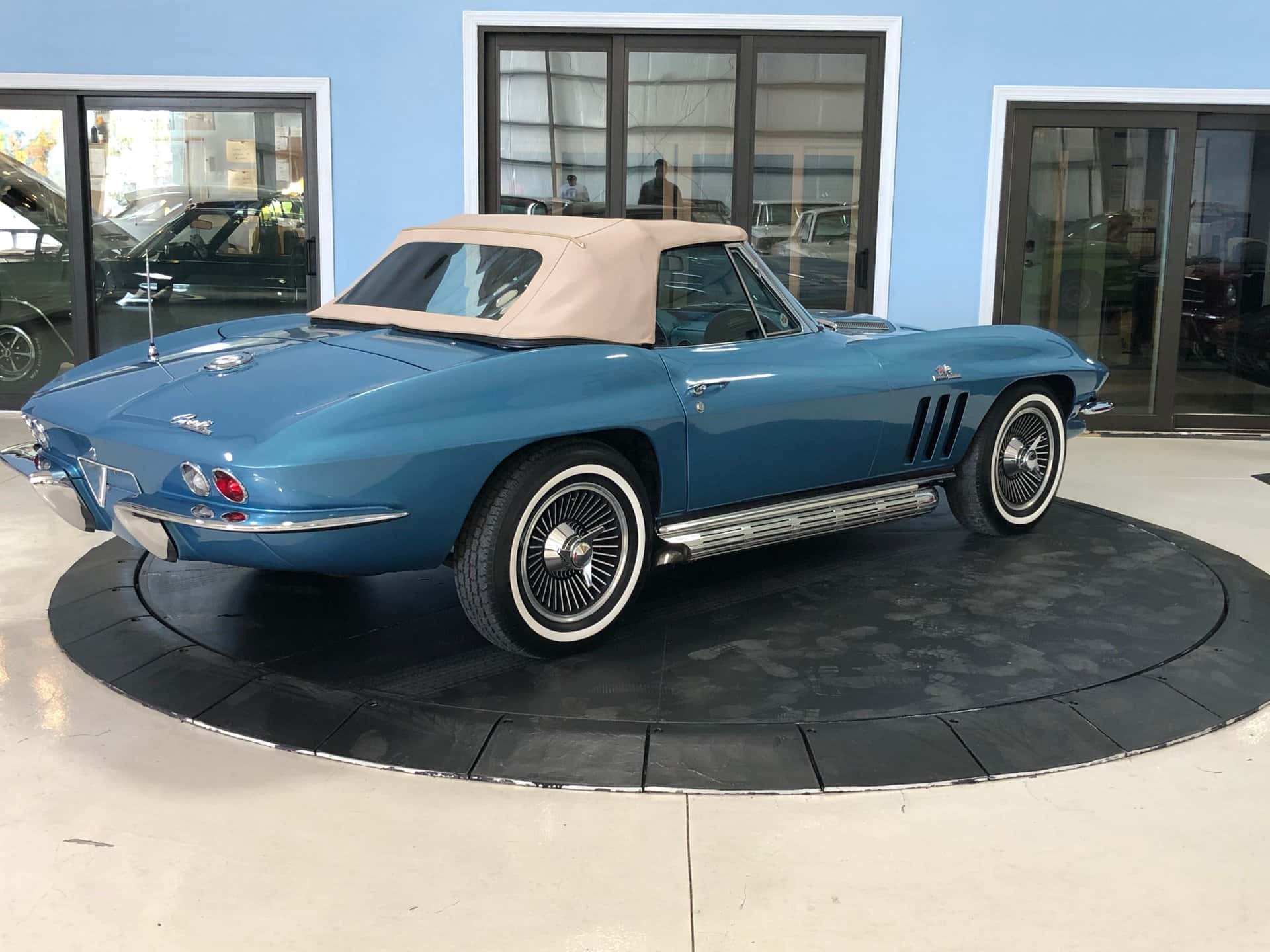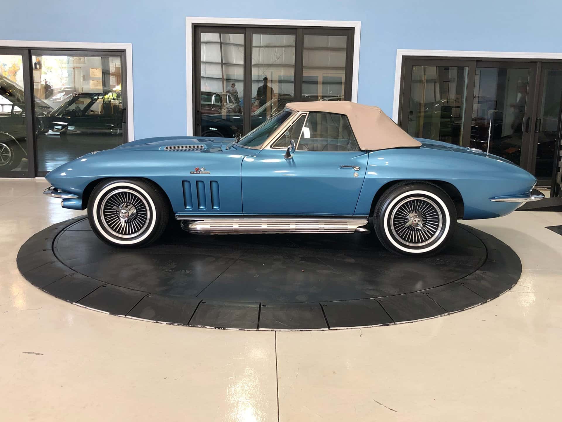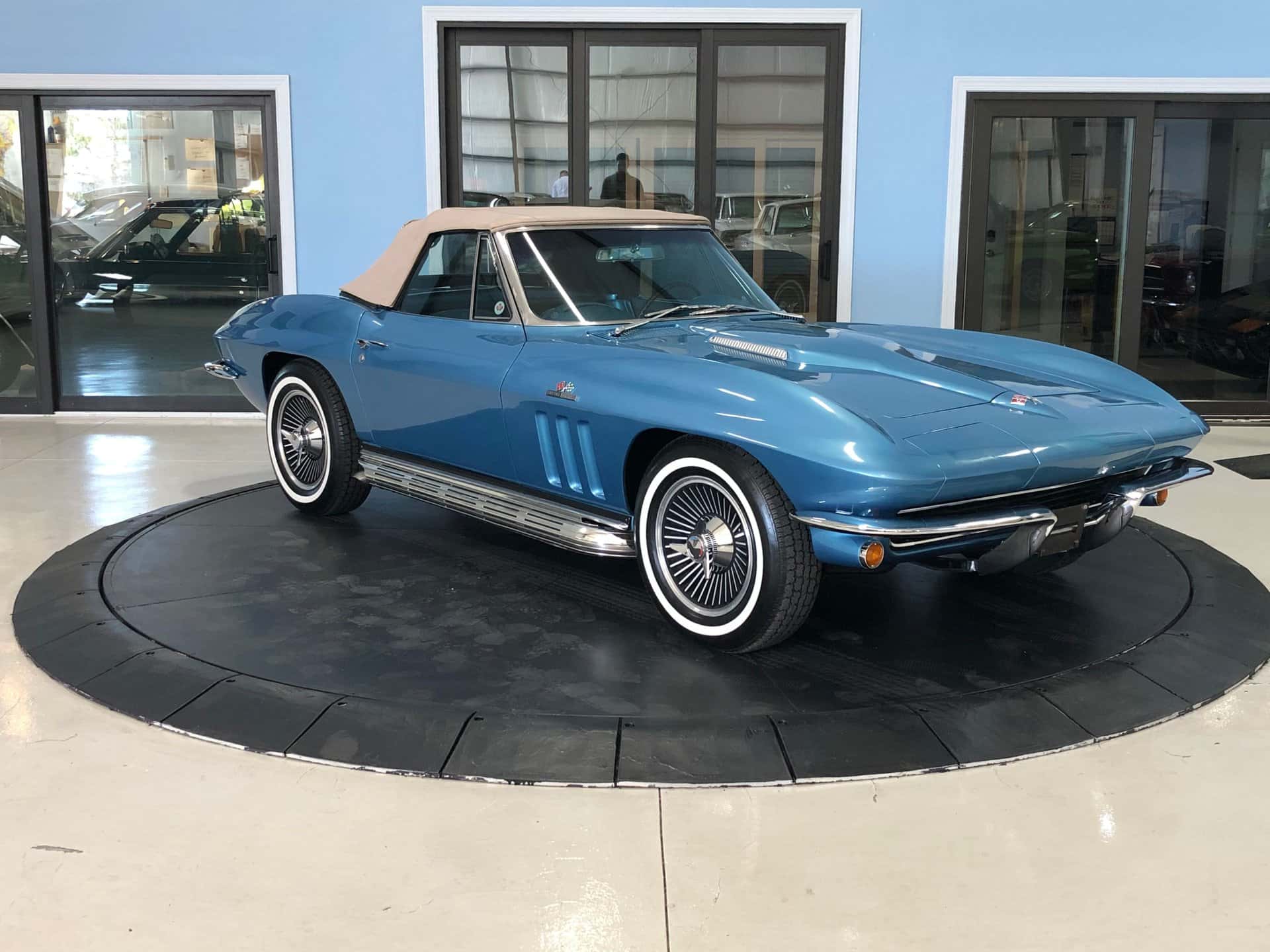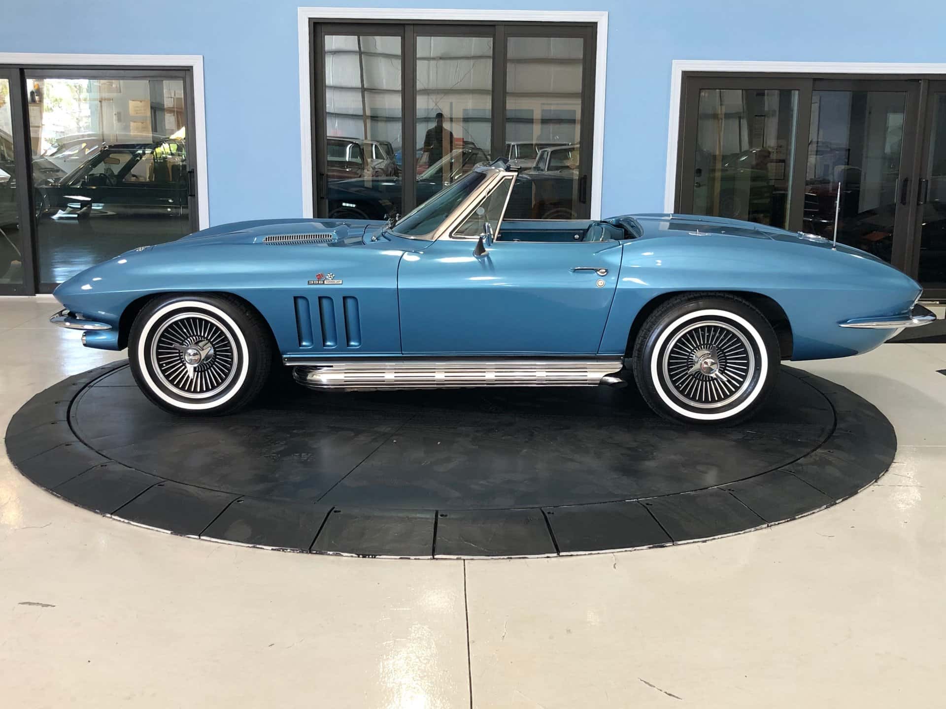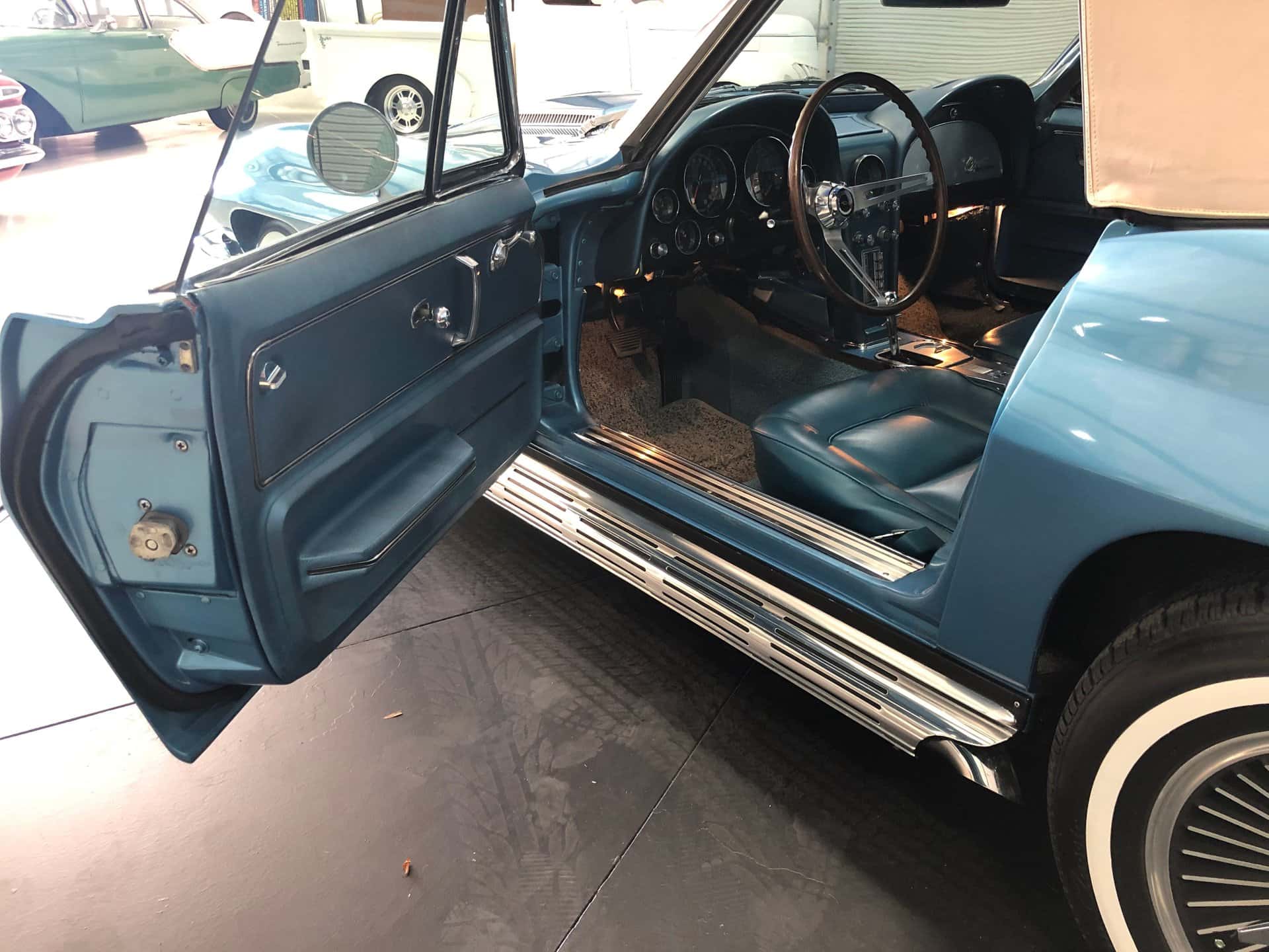 Why This Car? Exterior: This Sting Ray is painted in Nassau Blue, with scooped hood, louvered vents behind the front wheels, and intact emblems, bumpers, taillights, door handles, gas cap, and white convertible top. It rides on correct 15-inch cast aluminum wheels with knock-off hubs and whitewall tires, recreating the original look. Interior: The luxurious interior showcases new blue trim with expanded vinyl upholstery. It offers twin bucket seats with bolster-like design, blue carpet and door panels, dual sun visors, central console with heater and defroster controls, electrical gauges, and a wood steering wheel. Mechanical: This Corvette features a powerful Turbo-Jet 396 cubic inch engine with 425 horsepower, one of only 2,157 L78 examples produced in 1965. It has “porcupine” cylinder heads, aggressive cam, chrome open air cleaner, orange painted valve covers, side-pipes, aluminum intake, Holley carb, and a Muncie 4-speed transmission. The chassis is correctly restored with all the right parts. Call us today and get your dream car!