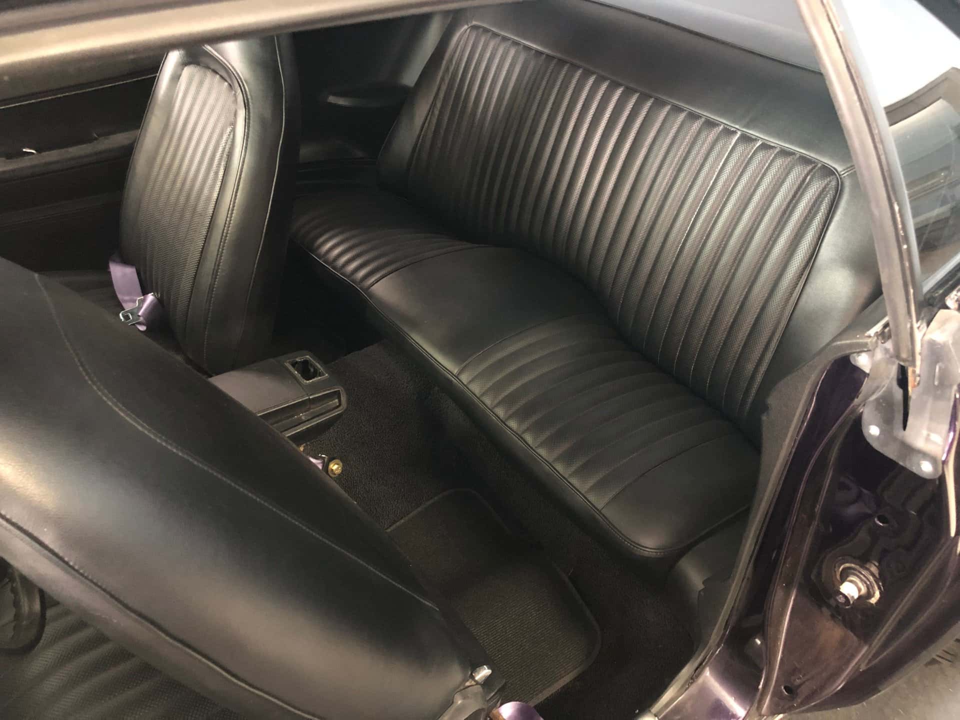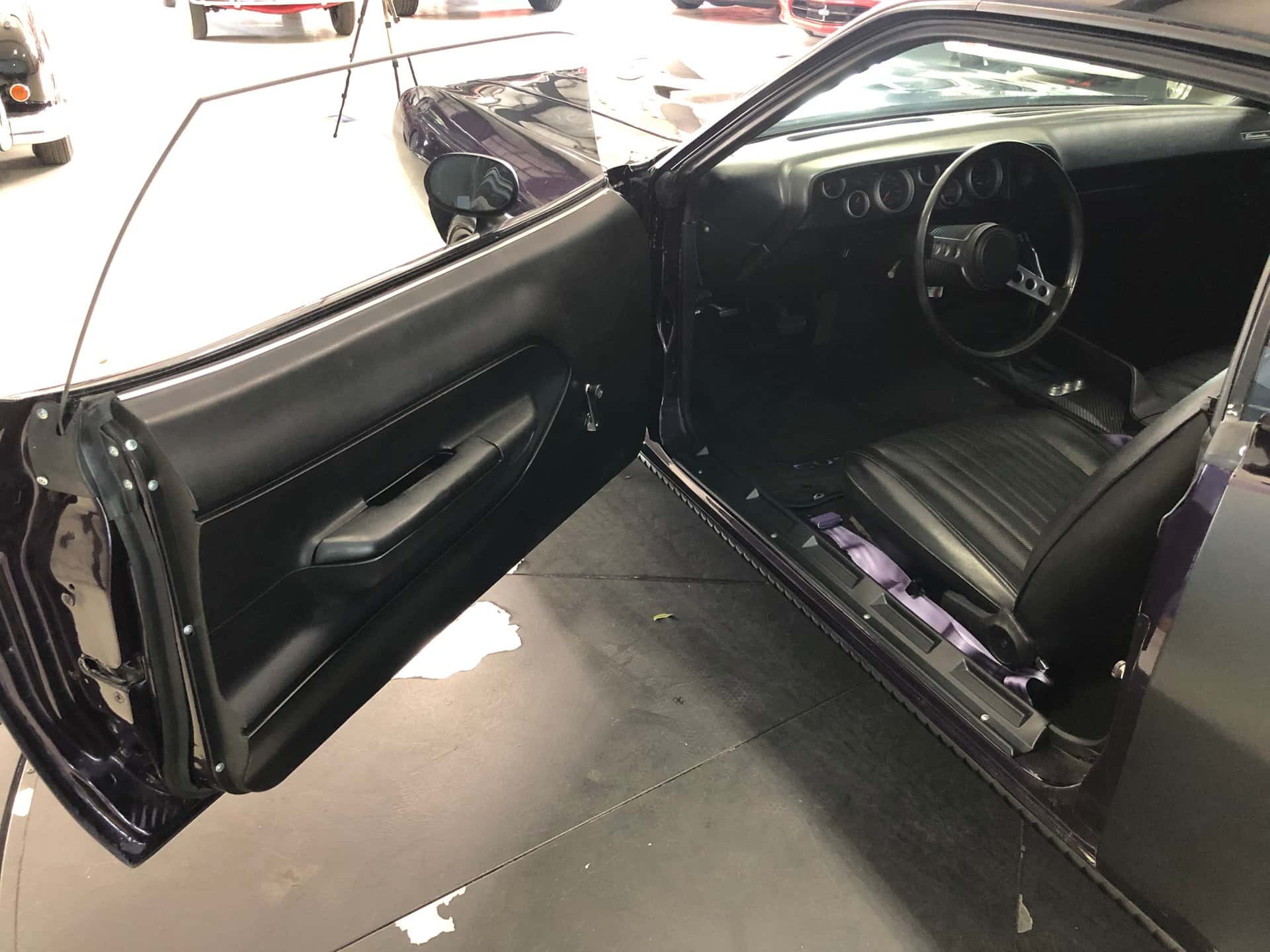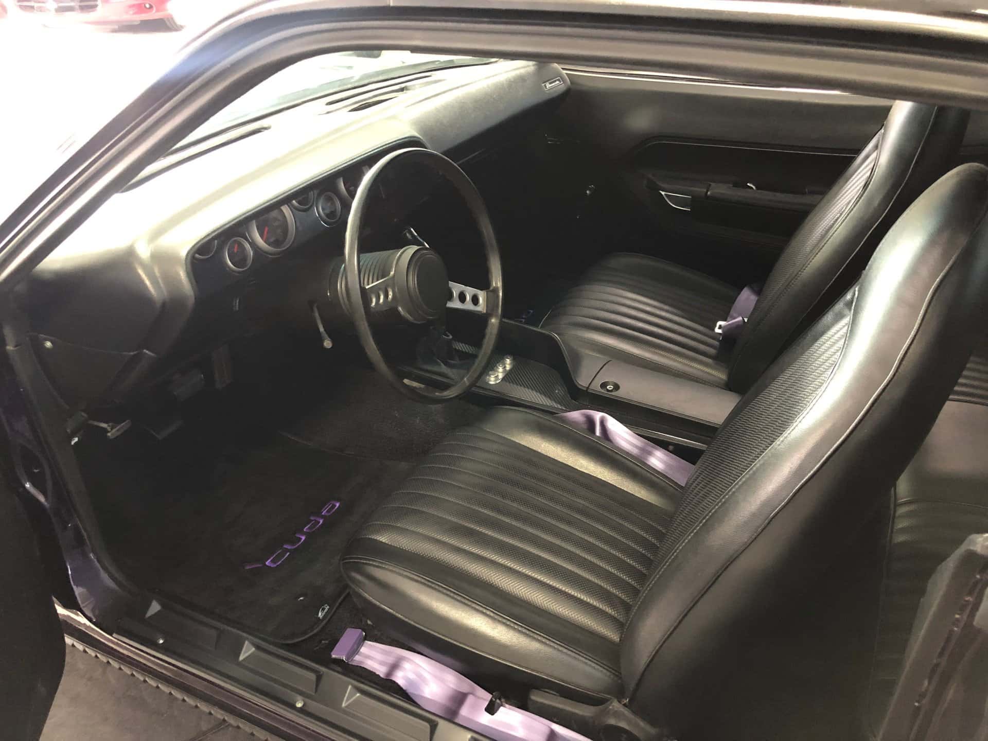 Why This Car? Exterior: The body lines of this Cuda have been restored to a better-than-original condition, and the purple paint shines brilliantly. Matte black “billboard” decals on the rear quarter panels proudly display the “440” cubic inch engine. The car features custom flush mount front grilles, hidden headlights, hood scoops, a rear spoiler, and twin racing mirrors, all adding to its aggressive and distinctive appearance. Interior: The black bucket seat interior is superbly maintained and retains a stock appearance, with a few modifications. Carbon fiber inserts adorn the dash and console, aftermarket performance gauges have been installed, purple Cuda’ logos are featured on the floor mats, and purple seat belts add a touch of flair. The rear seat and door panels maintain their stock appearance, as does the black carpet and headliner. The car is equipped with a black sport steering wheel and the famous “Pistol Grip” shifter mounted in the factory black floor console. Mechanical: The engine in this muscle car is significantly more powerful than the original 1973 stock engine. Originally a 440 cubic inch engine, it has been increased to a massive 513 cubic inches. It boasts numerous high-performance components, including a performance cam and kit, an aluminum Mod Man intake, a performance Holley carburetor, MSD ignition and box, a reworked fuel supply system, a custom performance twin open-air cleaner box and system, a serpentine belt system, performance heads, big tube headers, aluminum valve covers, a chrome battery box, a custom aluminum radiator, and more. The power is transmitted to the rear wheels through a heavy-duty 6- speed transmission and a Mopar rear end. The exhaust note is impressive, and the ride quality is enhanced with the chassis and suspension upgrades. Call us today and get your dream car!